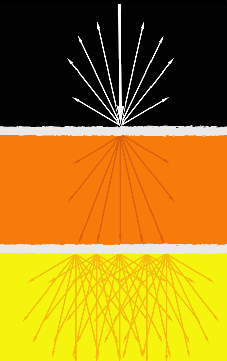 The incident light rays are transmitted through the first semi-matt external layer and are further diffused by the inner wall, which acts as a sort of light source, as simplified in the following drawing.