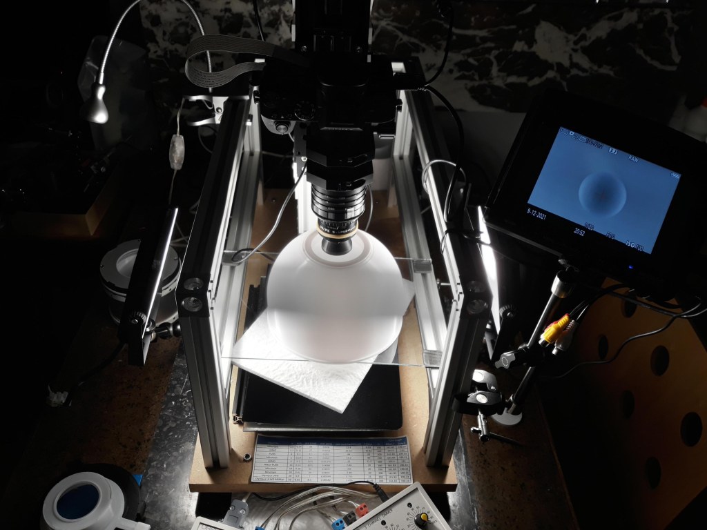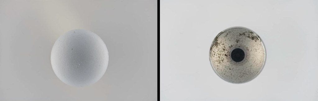 Due to the position of the light source, I can’t obtain a complete homogeneous light diffusion (like the one obtained with the cylindrical system), but the tests carried out using two spheres as a sample (one in plastic material and one in metal) are encouraging. A third light and orientation of 120° between the sources give better results.