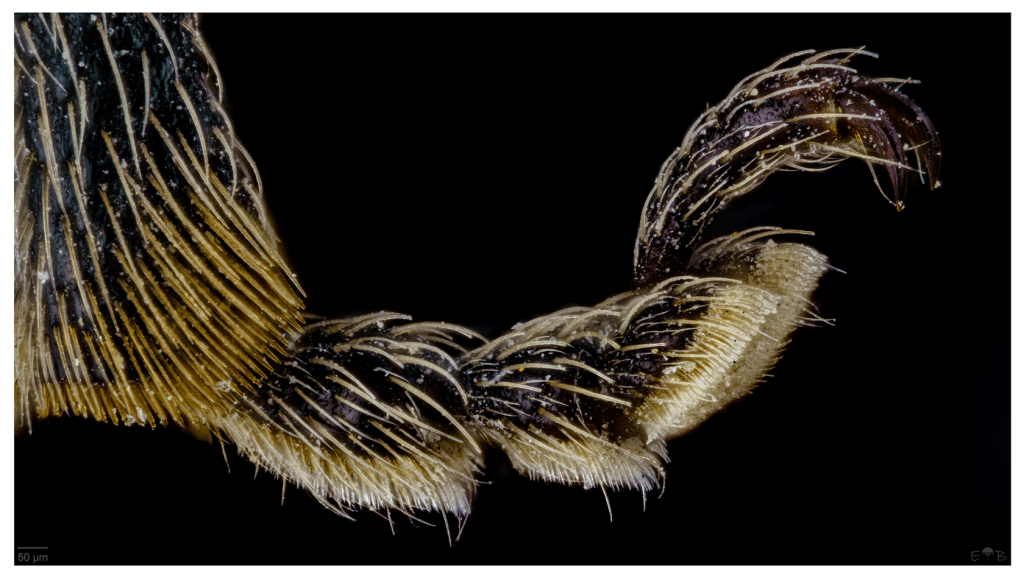 Otiorhynchus sulcatus (Curculionidae, Coleoptera) posterior leg with terminal hooks, and the characteristic setae. Image acquired with a Mitutoyo 20x, stack composed of 219 images. Acquisition time 1/3″, with step of 2µm between each photo.