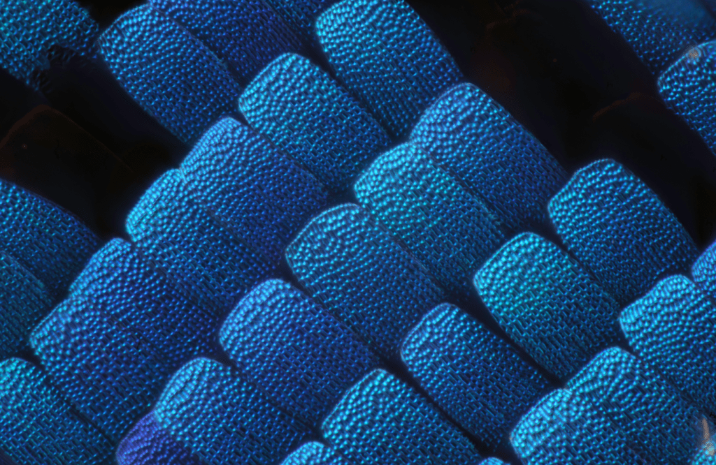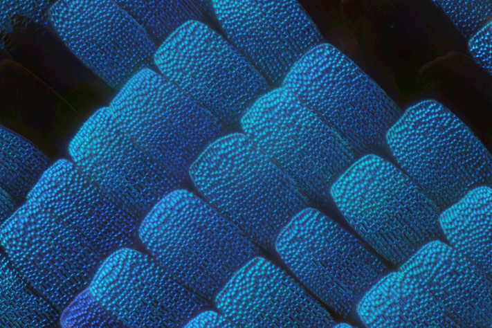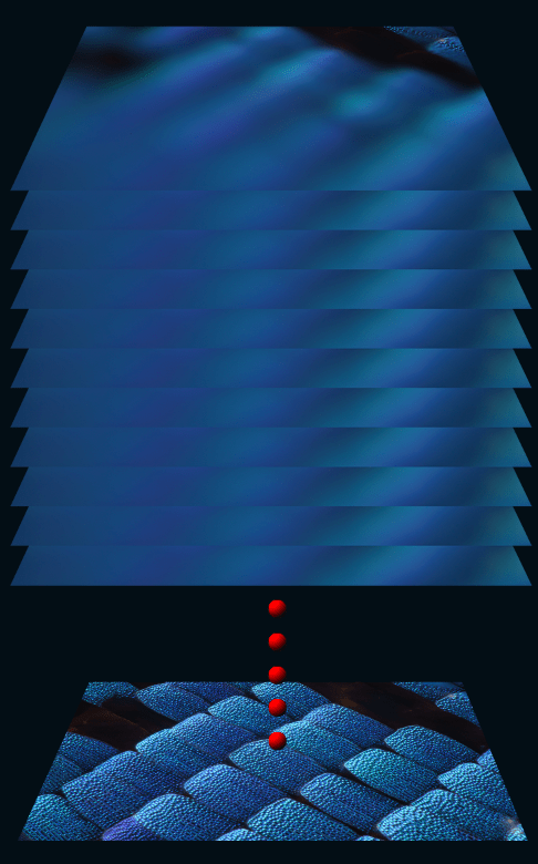 To perform this analysis, I used as subjects the tiny scales of a beautiful butterfly Papilio ulysse acquired with a 50x Mitutoyo lens, Pseudobrookite crystals, with a 5x Mitutoyo lens, and a bee, with a 2.5x Mitutoyo QV lens.
