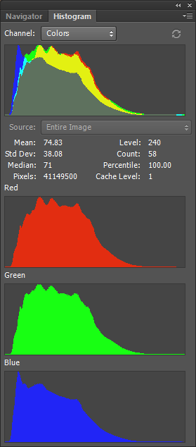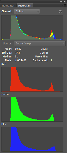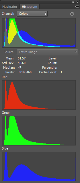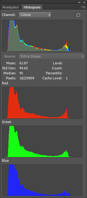 Let’s go to explore the distribution of the pixels for the three bands (red, green, blue) composing the 16bit image of the butterfly scales.