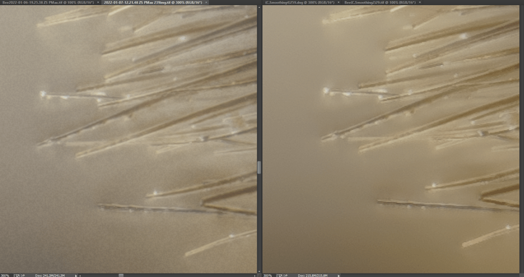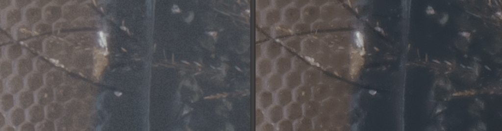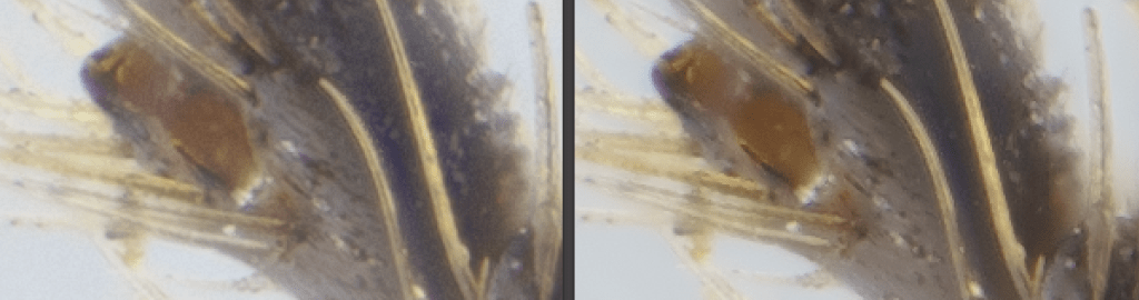 HF output presents a «crispier» image losing locally slightly in detail but increasing the contrast in the presence of linear structures as, for example, in the bee’s bristles. This contrast in some cases is visible locally as a sort of jaggedness, which is less visible in ZS (structures that are eventually noticeable zooming at 300%, but invisible at full resolution).