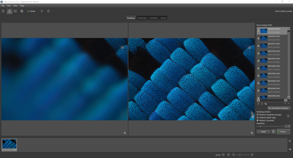 For the butterfly scales dataset, a first image test was calculated using HF by importing the ARW format directly into the software. This program allows you to read the native RAW formats of the main photographic cameras, convert them temporarily to .TIF format, and save them in .DNG format while keeping intact the colorimetric profile present in the initial RAW. It is important, therefore, to consider having the necessary space to save the temporary files created on your hard disk. The calculation to obtain the final image, using all 330 frames took 15′ 21.07″.
