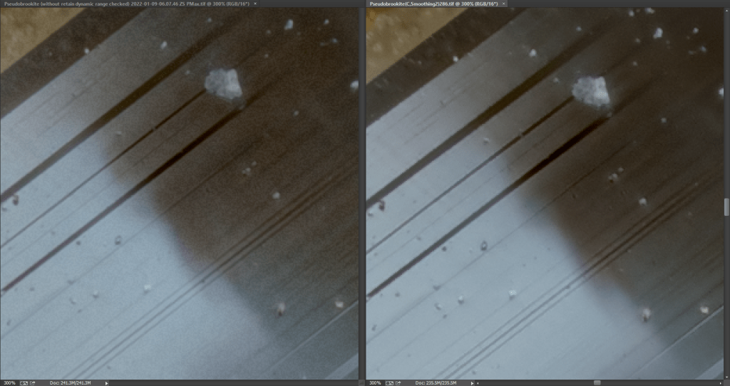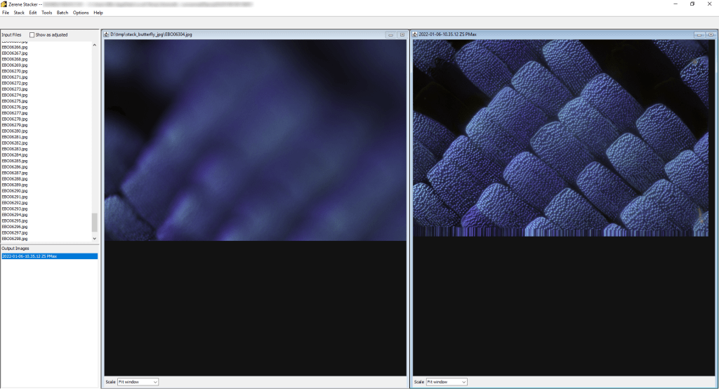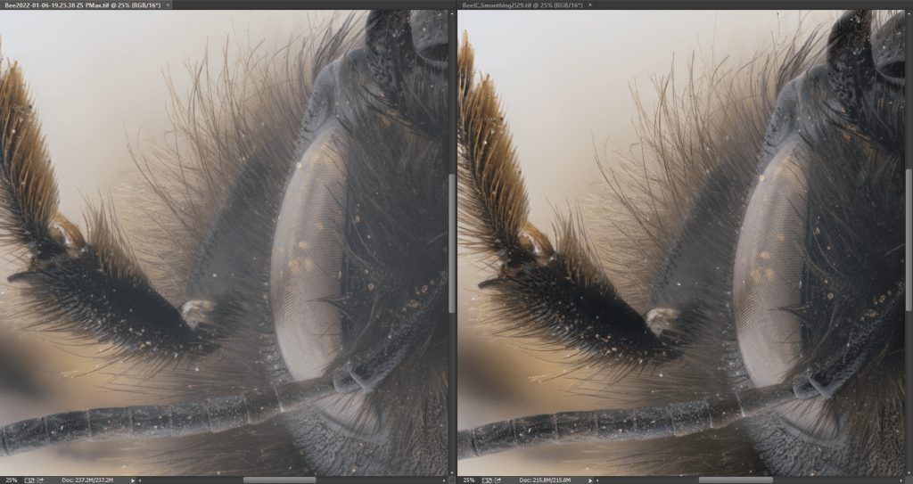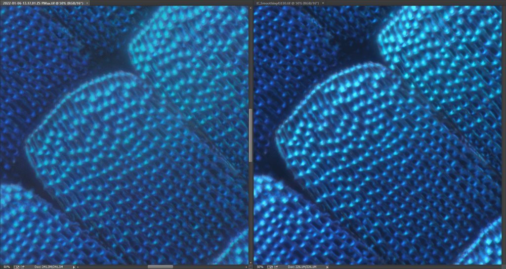 Zerene Stacker is much slower but gives access to parameters allowing more personalized/fine-tuned results. This requires spending a bit of time studying the platform and the options (but the documentation is very well done and complete), even if the look and feel is a bit “outdated”. Personally, I find the output image concerned by important noise also if not really affecting the result (but I may have omitted to check some parameters in the preferences of the software to remove this noise).