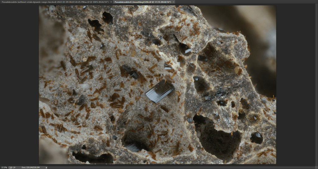 Pseudobrookite mineral: the stack consists of 286 images, with an acquisition step between one frame and the next set to 10µm; the lighting used is based on continuous LED light, using the illuminator OGGLAB DB120EB and exposure time set to 1/60 “.