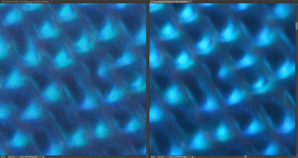 Pushing the magnification of both images to 300%, we can observe a distributed noise that permeates the image created with ZS, while the image obtained by HF is more homogeneous, smoothed, and without (or less) noise. Apart from the presence of noise in ZS, there are no differences in detail in both images.