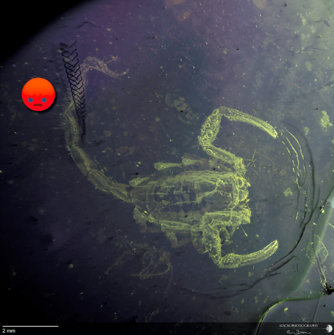 A recurring problem after multiple acquisitions have been made in glycerin is the presence of inclusions that float or move freely in the liquid. These are synthetic fibers that are present in the air or left behind by the fabrics used to dry the glassware or dropped accidentally. The slow movement is recorded in the frames you take, and the result often risks compromising the final photograph. In the example below, a beautiful (and rare) scorpion is “photobombed” by a hair that slowly and quietly crosses the field of view, leaving an irreparable trace that is impossible to remove.