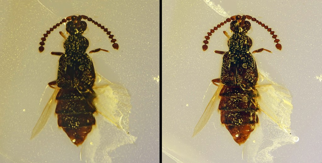 The subject is a small Staphylinidae (Coleoptera) having a size slightly larger than one millimeter, but the image (a result of a stack of 58 images, and acquired with an objective APO Mitutoyo 5x) appears to be affected by those typical effects of optical distortion that are visible in subjects that are not located near the surface of the amber, or when you are in the presence of layers with different density and optical characteristics.