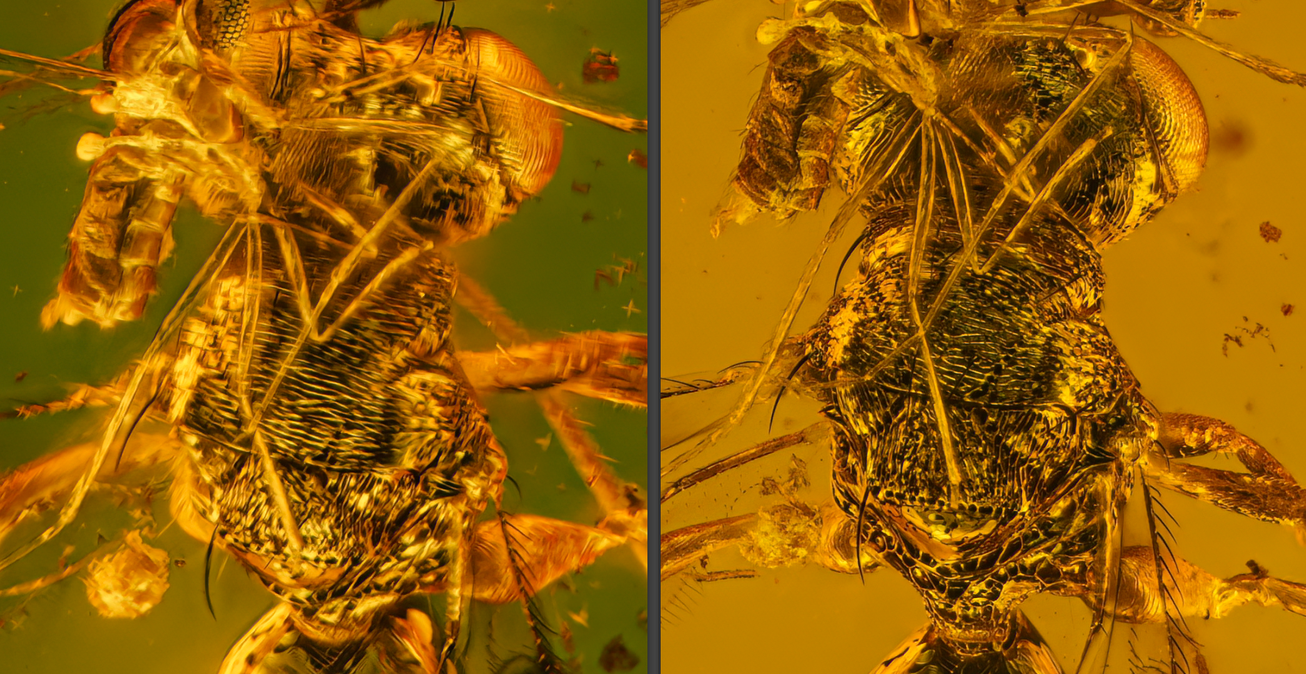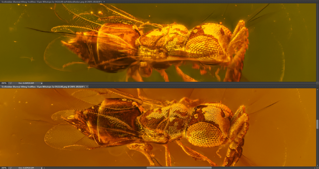In the example below, I offer you two other subjects, acquired before (green background) and after (yellow background) the abrasion process with sandpaper (grit 1200 – 3000 – 4000 and cloth). It clearly emerges how, following the removal of part of the amber (~1mm), the details appear much sharper. The optical distortions visible in the composite eyes, antennae, thorax, and setae present on the wings of the subjects have been removed.