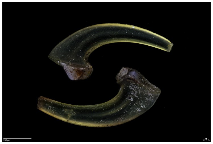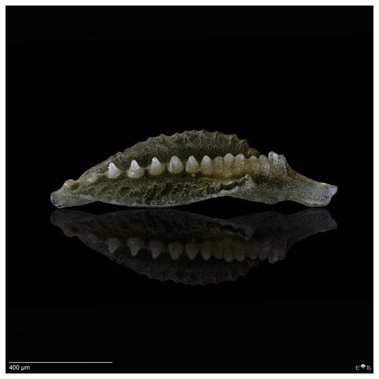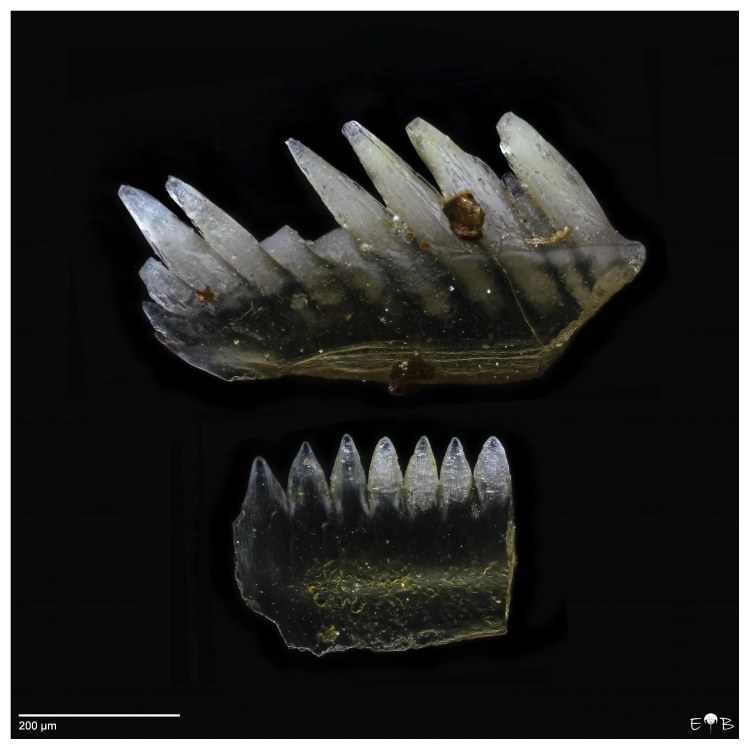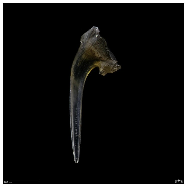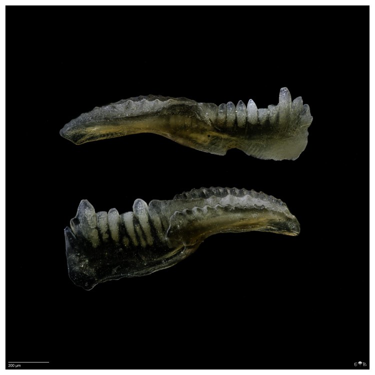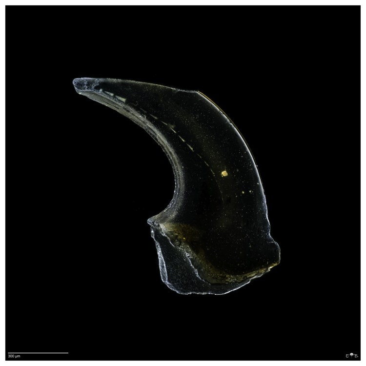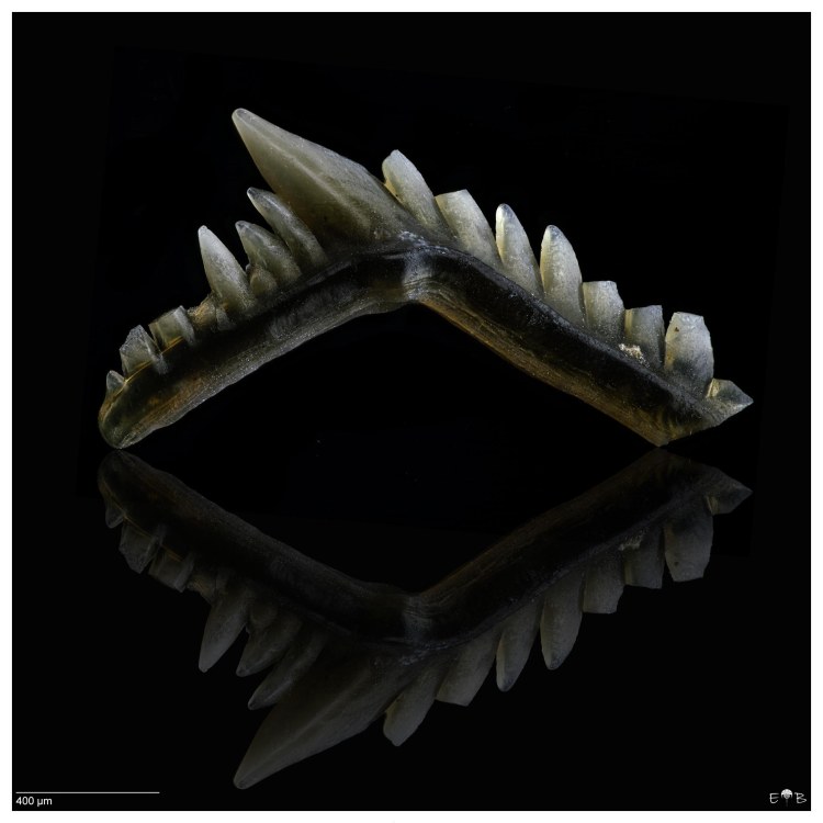 Scolecodonts are the jaws of polychaete annelids (segmented bristle worms). Fossil scolecodonts are particularly common in Ordovician, Silurian, and Devonian marine deposits, but the organisms they come from have existed from the Cambrian to the Present. The vast majority of species are marine. Though scolecodonts are generally tiny, one of the largest scolecodonts ever found—Websteroprion armstrongi from the Devonian of Canada —was more than a centimeter in length and is estimated to have belonged to a giant worm that may have grown as long as a meter.