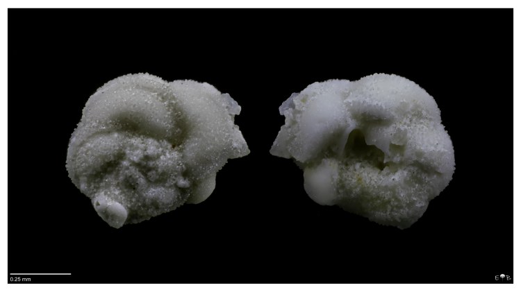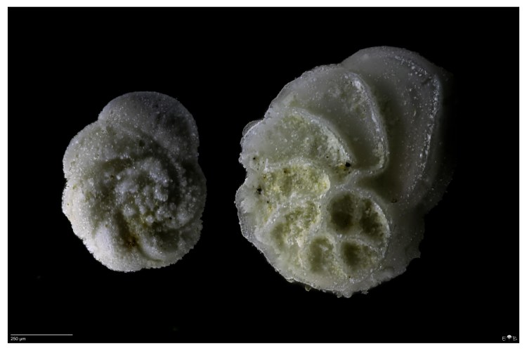 Foraminifera are the external shells (or “tests”) of single-celled protists (that is, organisms that are classified as neither animal, plant, or fungus). Most foraminifera are marine, and the majority of these species live on or within seafloor sediment. In their forms and shapes, they are among the most diverse of microscopic creatures. As fossils, they are valued as indicators of paleoclimate and as index fossils.