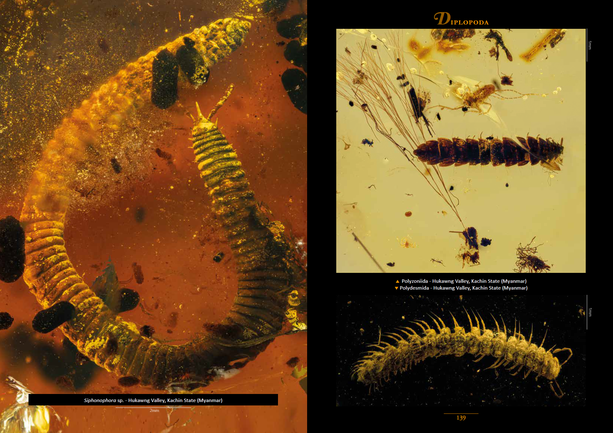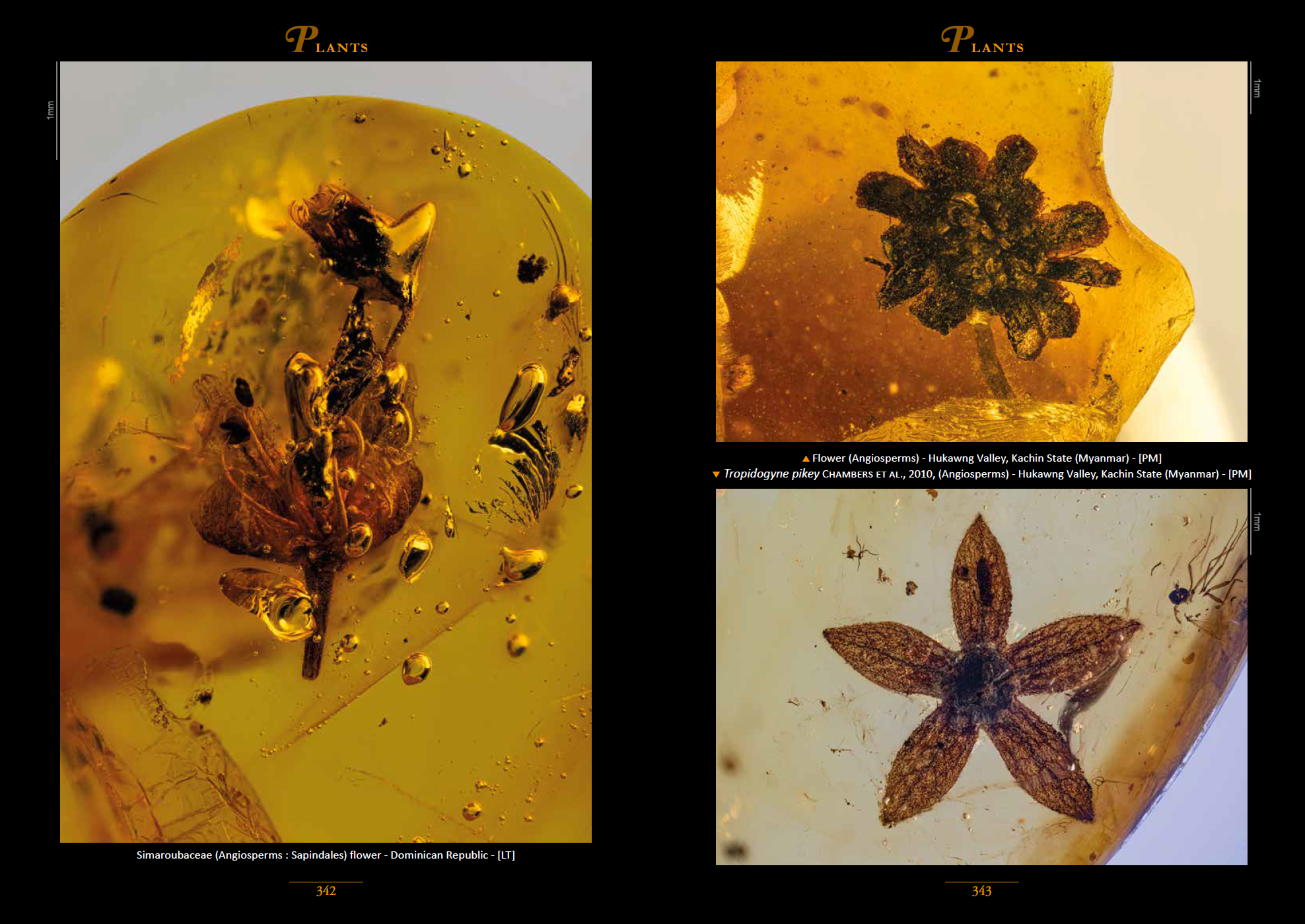 The topics are arranged alphabetically, beginning with the Amphipoda and ending with the Vertebrata. Also included are fungi and various plants, with a very attractive photo of the flower of Hymenaea protera, the legume tree that produced Dominican amber. Many subjects were photographed in cross-polarized light, giving them a vivid coloration.