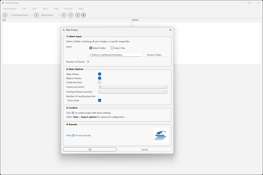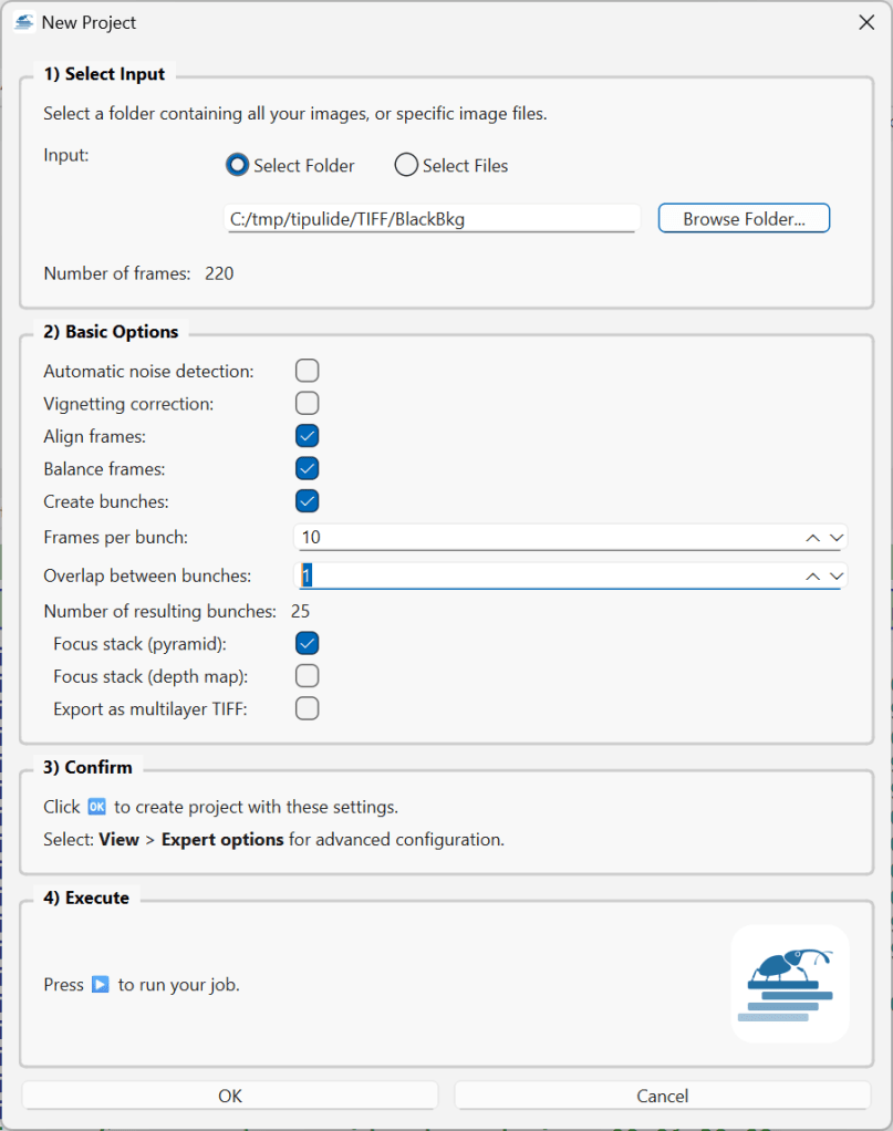 Upon launching ShineStacker, you’ll be asked to select the folder containing your images (.tif or .jpg), in either 8-bit or 16-bit format. Depending on your computer’s processor, a small alert window may appear, notifying you that the processing time could be relatively long if you’re working with a large image set.