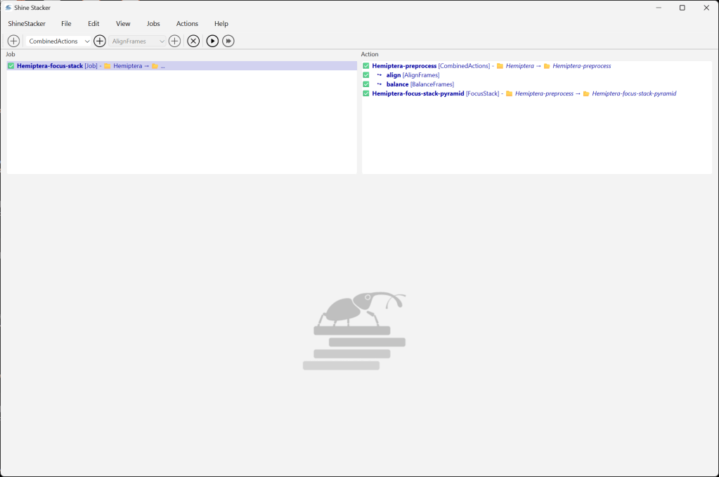 The upper section displays the main menus and lists the actions that the program will execute during the stacking process.