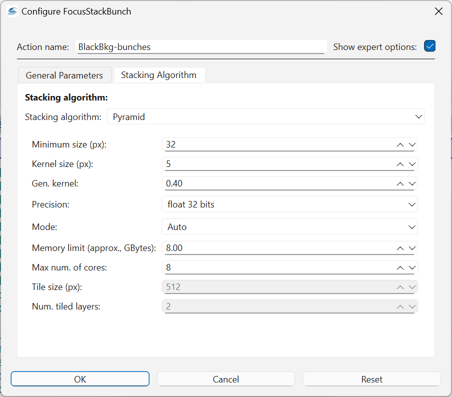 At this stage, you can already choose the focus stacking method — in this case, I selected the Pyramid method.