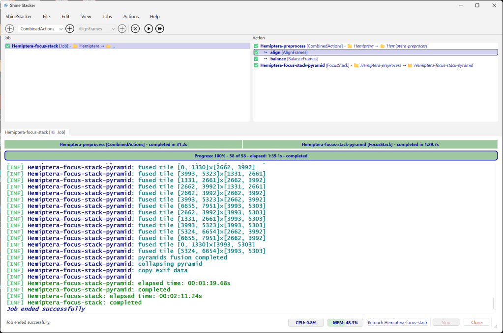 In my example, I used a series of nineteen images, which took 2 minutes and 11 seconds to analyze and produce the final stacked image — an excellent performance.