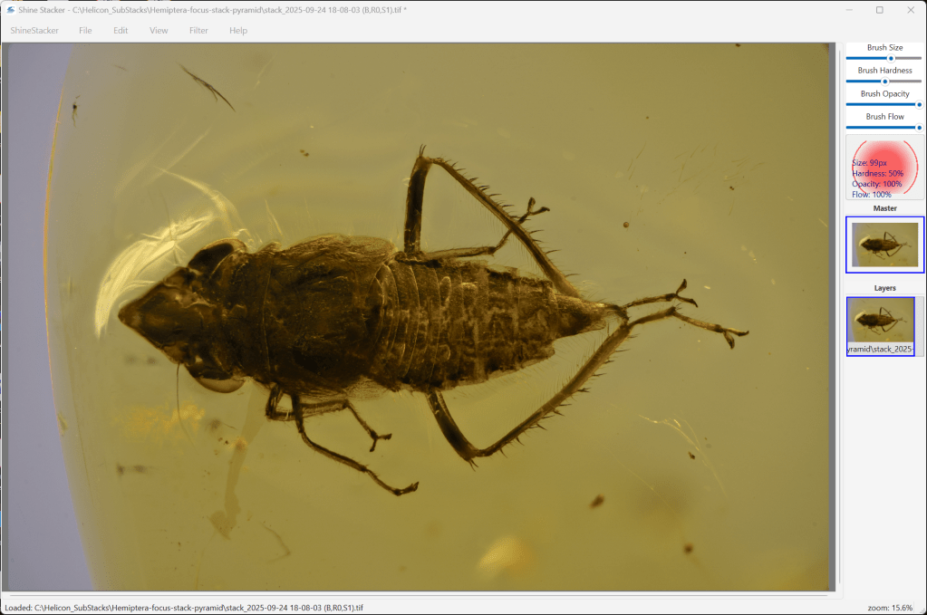 In the Retouch window, ShineStacker automatically imports the generated sublayers (bunches), allowing you to fine-tune or adjust parameters before exporting the final image.