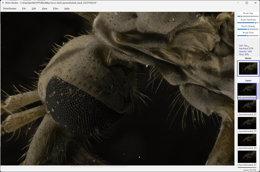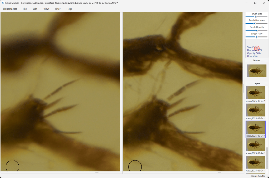 These sub-stacks can then be imported again and combined into a final image using the Depth Map method — a very useful approach when working with subjects rich in fine hairs, such as bees.